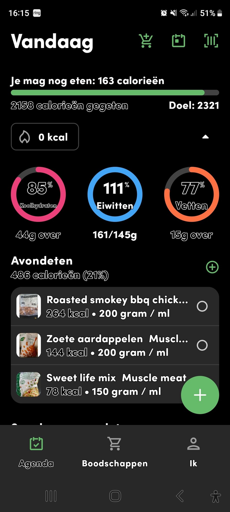 Voor mij werden dus 2470 calorieën berekend, wat voor mij niet voelde als een calorietekort. In de 8 weken heb ik dit nauwelijks veranderd. Na het delen van mijn voedingsoverzicht na week 1 met de coaches moest ik zelfs meer gaan eten, en vooral koolhydraten.