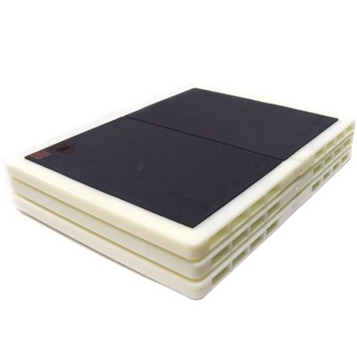 De zwarte breekplank met foam is 2,3 cm dik en 28,5 x 28,5 cm.