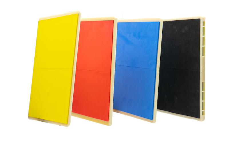 (blauw): aanbevolen voor beginners/junioren, gemakkelijk te breken. Alleen gebruikt voor het inspireren van vertrouwen en om een gevoel te krijgen van hoe een massief object aan het raken zou kunnen zijn. Afmetingen: 30,5 cm x 23 cm. 1,3 cm dik.