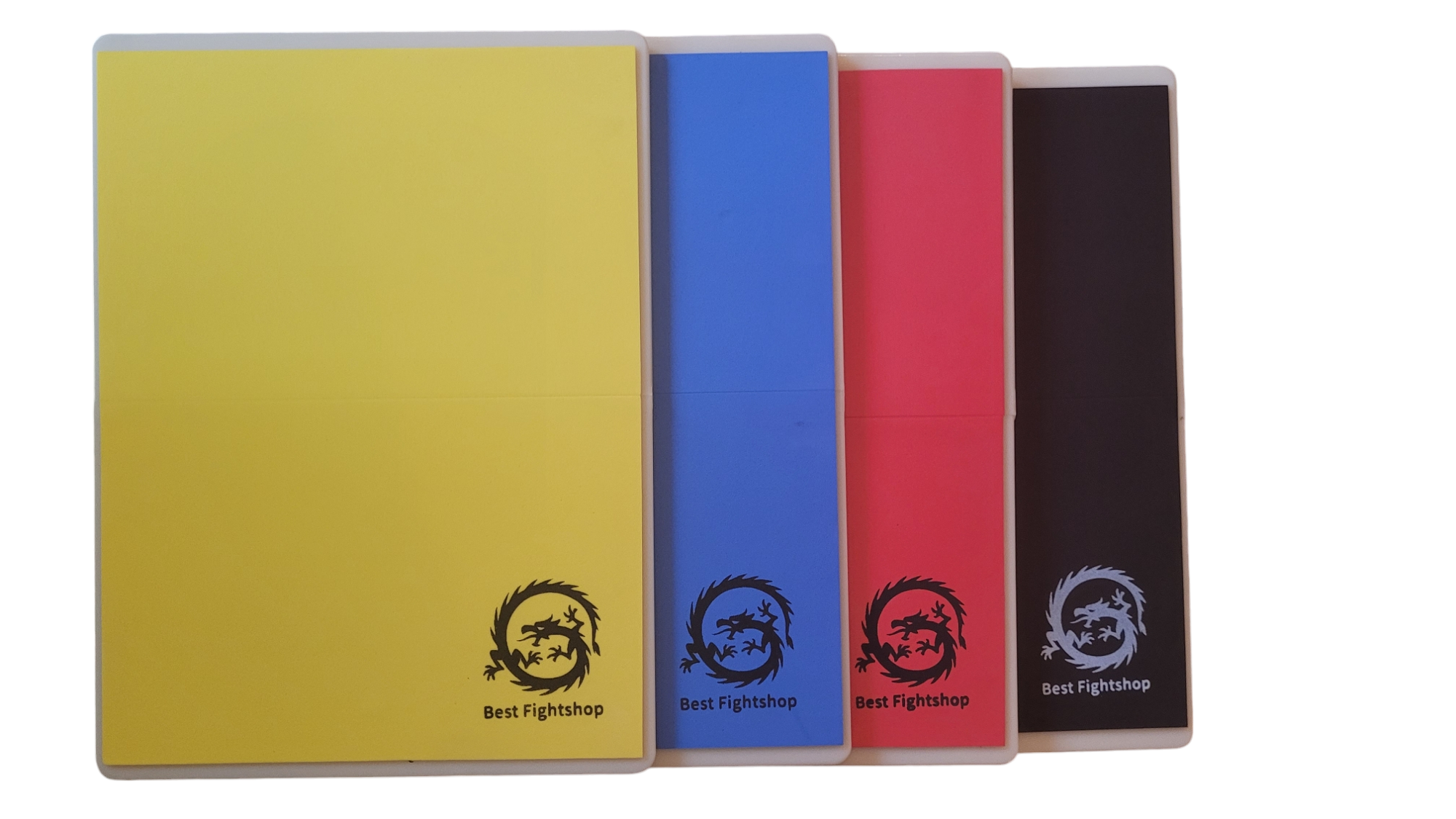 (geel): aanbevolen voor beginners/jeugd, gemakkelijk te breken. Alleen gebruikt voor het inspireren van vertrouwen en om een gevoel te krijgen van hoe een massief object aan het raken zou kunnen zijn. Afmetingen: 30,5 cm x 23 cm. 1 cm dik.