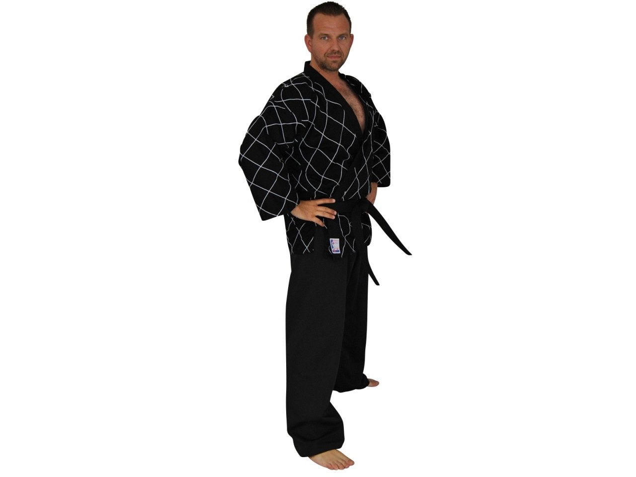 Hapkido zwart pak Wit ruitpatroon. Geheel zwarte broek met elastische tailleband, gemaakt van 10 oz Mischewebe (55% Poly/45% katoen). Daardoor bijzonder sterk en stabiel wassen, maar toch licht en comfortabel om te dragen. Kortere mouwen, zonder riem