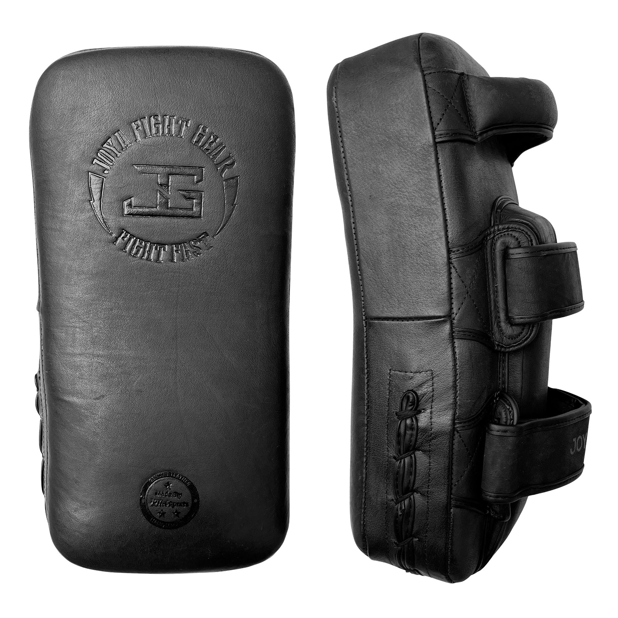 Zwarte Joya 'Fight Fast' Dura Pad – Faded Black, per paar geleverd. Robuuste pads om schoppen op te vangen tijdens een partner-training. De pad is om de onderarm vast te zetten met klittenbandsluitingen. De pad heeft een kussen en handvat zodat de pols minimaal belast wordt. Duurzame pads die gemaakt zijn van echt leer, geschikt voor gebruik op professioneel niveau.