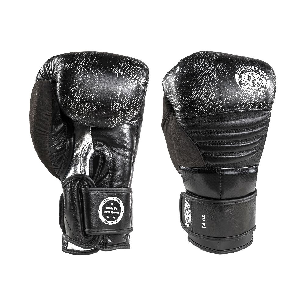 Gave kickbokshandschoen van Joya Fight Gear met dubbele klittenbandsluiting voor extra stevigheid rondom de pols. Prachtig afgewerkt met meerdere details: bovenop de handen zijn de vleugels van Joya in het leer verwerkt en om de handschoen heen een strook met koolstofvezeleffect. De handschoen heeft een vaste suède leren duim.
