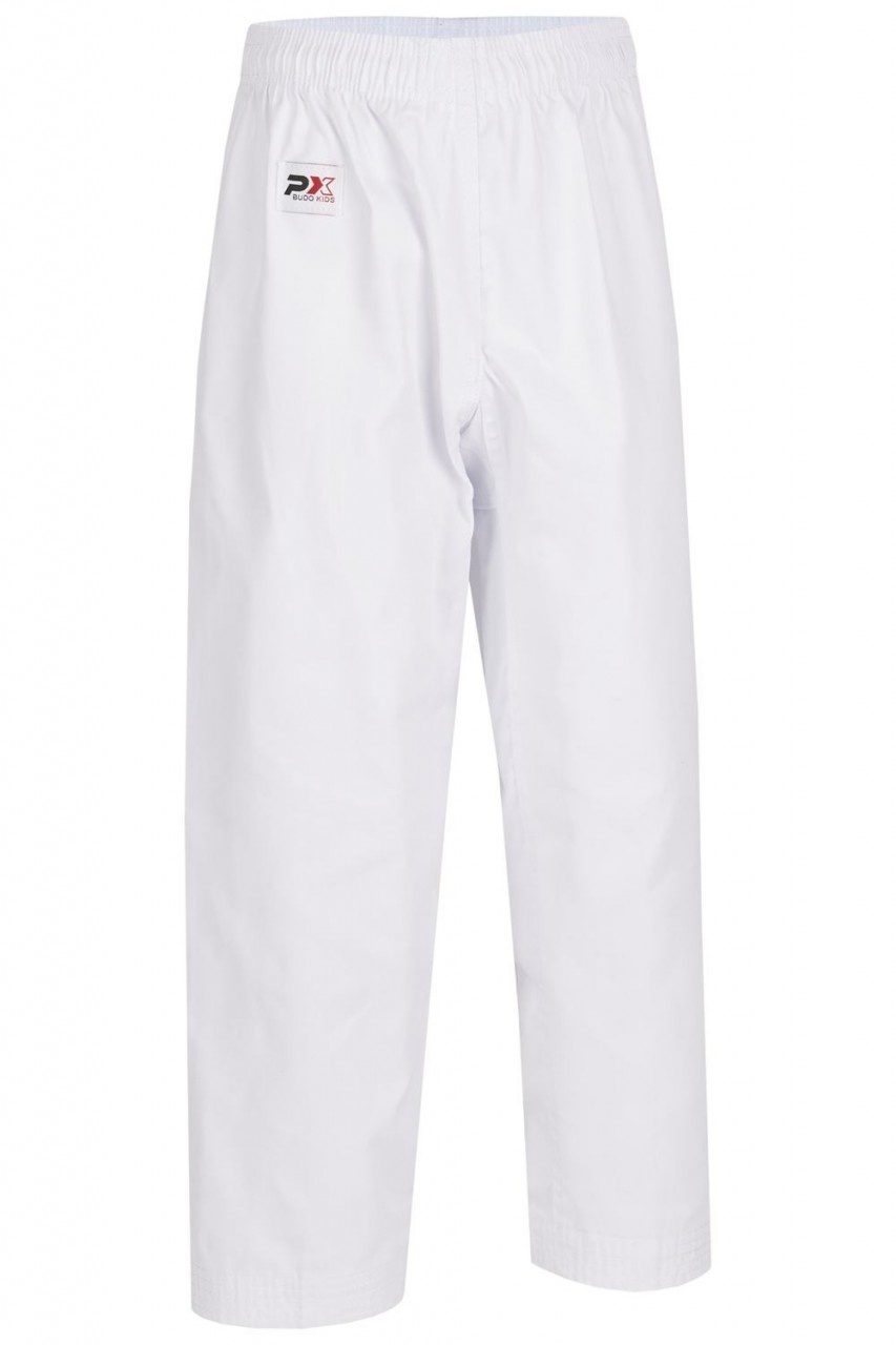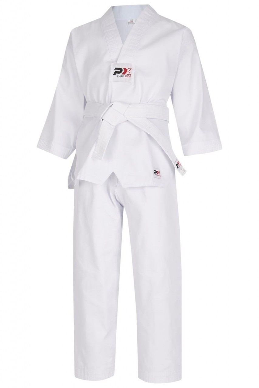 lichtgewicht kinderpak van 7,5 oz blend stof (65% polyester, 35% katoen), puur wit V-revers jasje, broek met elastische taille, wit, zachter dan normaal riem inbegrepen (gemakkelijker te binden) Ideaal voor groepen kleine kinderen in alle vechtsportstijlen, omdat jas gemakkelijk zonder riem kan worden aangetrokken en dit de trainer tijd bespaart (voor het voortdurend vastbinden van de losgeraakte riemen...) Jas in Taekwondo-stijl met V-hals, maar zonder enige verwijzing naar Taekwondo op de label, label is "PX Budo Kids" = alle sporten kunnen deze uniformen gebruiken