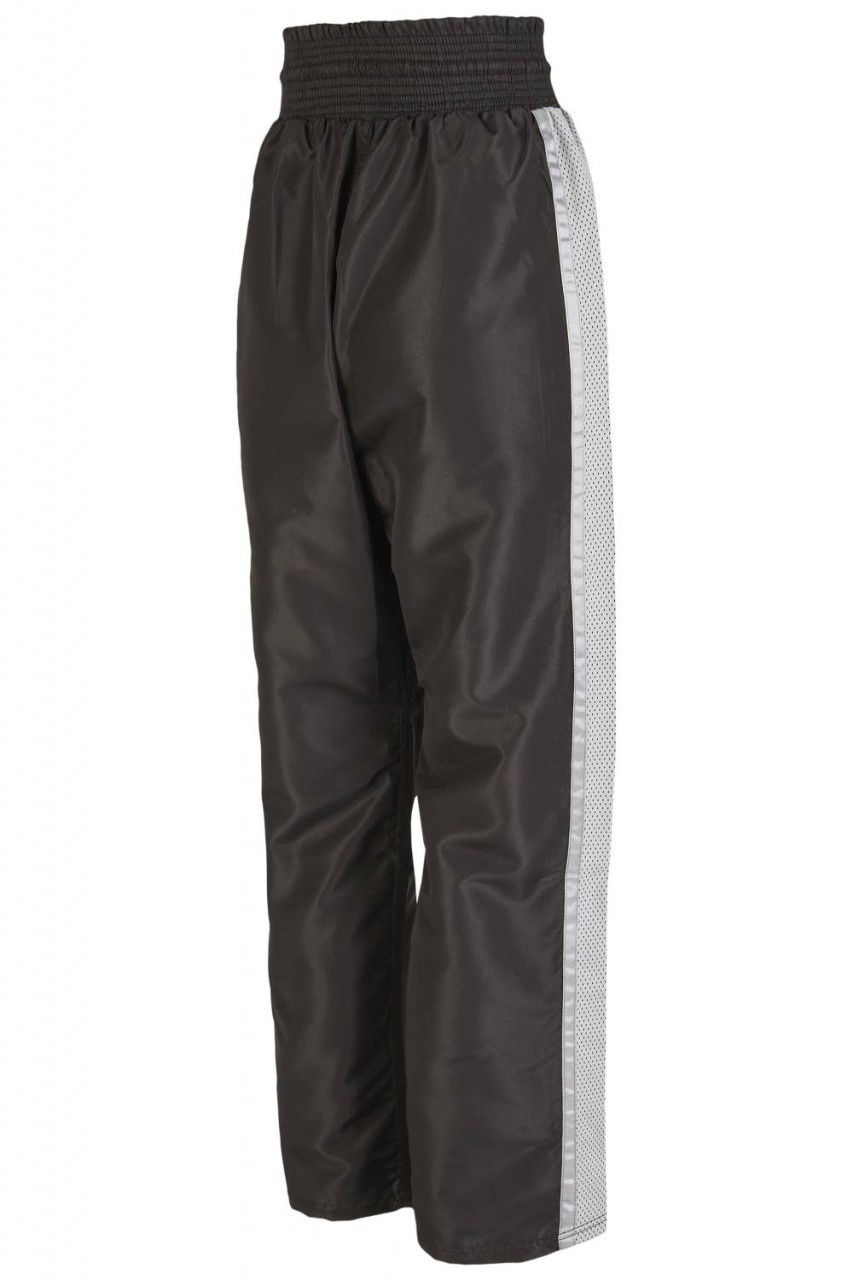 PX Kickboksbroek "Dynamic" zwart-grijs gemaakt van 100% polyester zacht geweven stof brede elastische taille, wijde broekspijpen en mesh-designstrepen aan de zijkanten