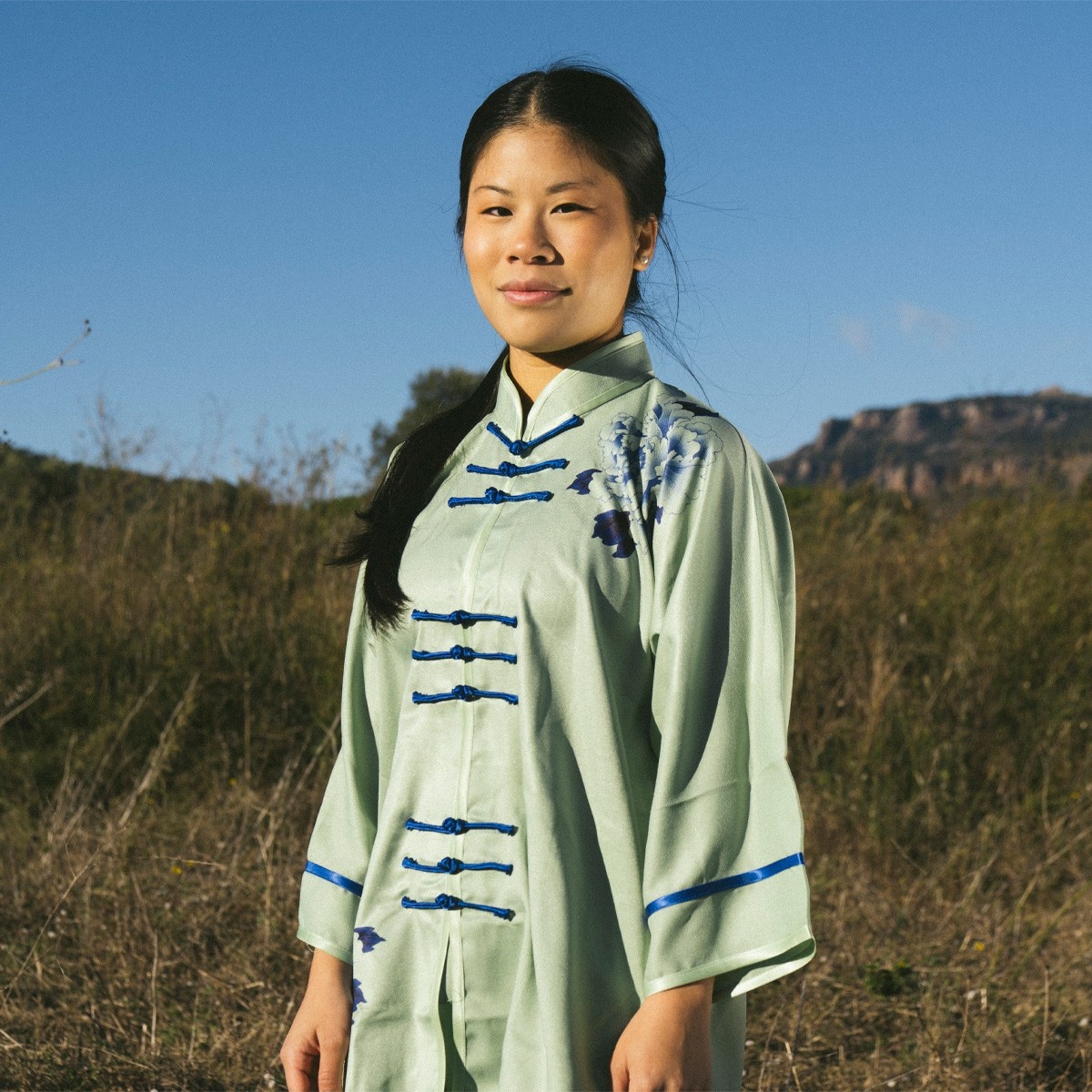 - Traditionele mandarijnkraag en 9 kikkerknopen om het jasje gesloten te houden.