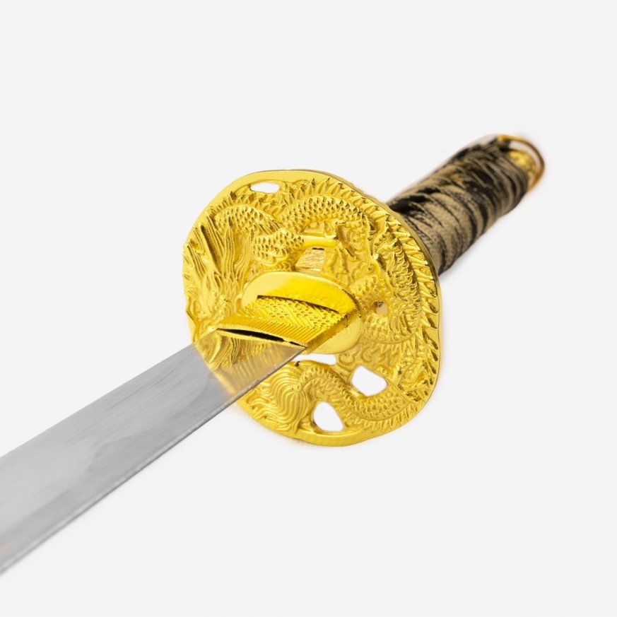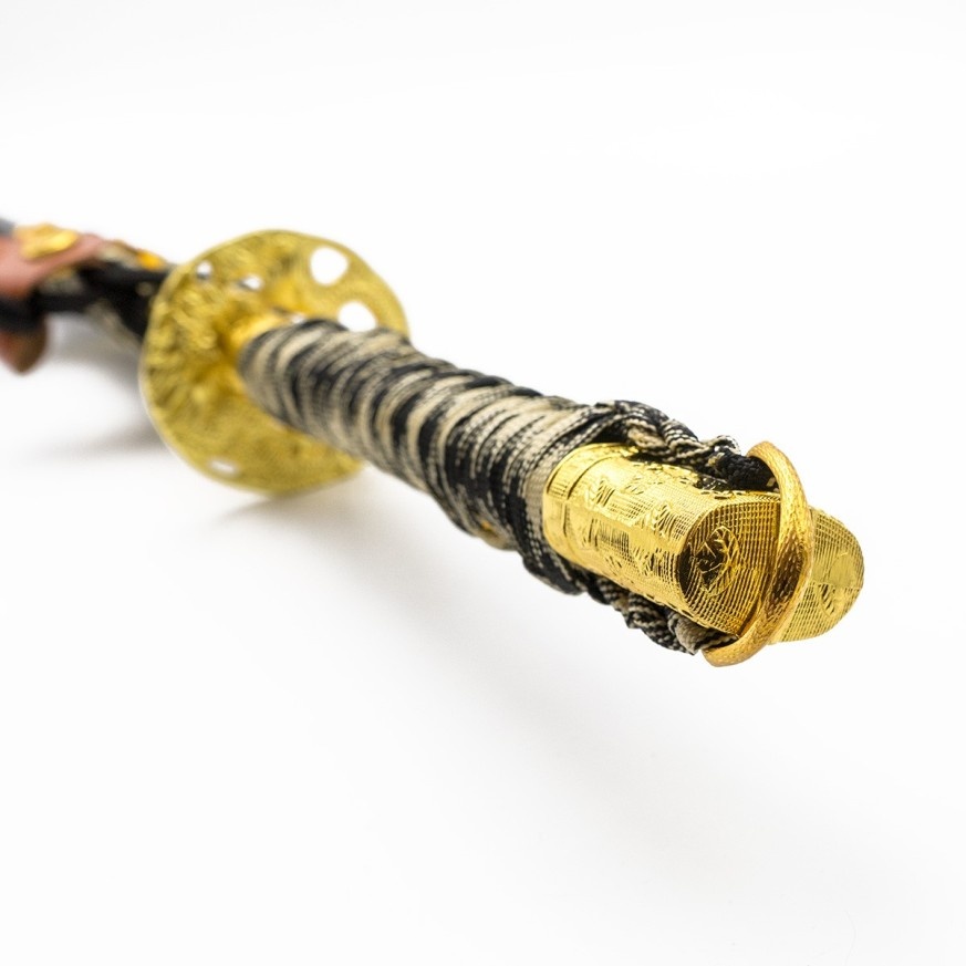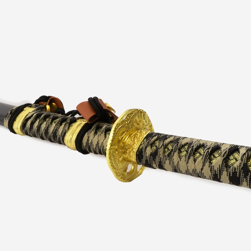 - Zwart gelakte bamboe houten Saya (schede). Zwart en goud gevlochten Tsuka (handvat) en vergulde legering Tsuba (zwaardbeschermer).