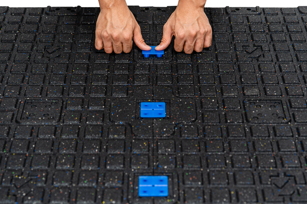 Stockz gepatenteerd impactbodemontwerp, voor schokabsorptie en vermindering van contactgeluid.