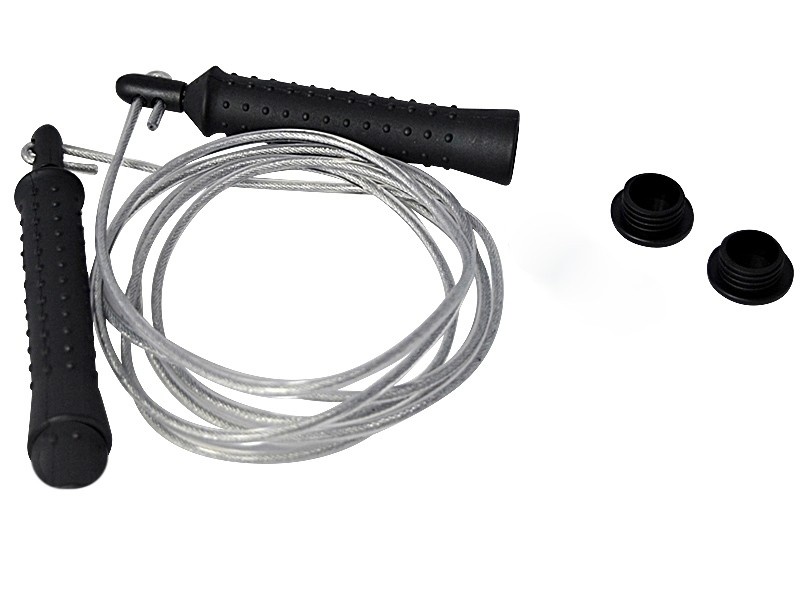 Springtouw met staaldraad, geplastificeerd, soepel op het handvat gemonteerd, 280 cm lang, eenvoudig in te korten lengte zoals gevraagd door het handvat. Door het kabelgewicht een lekker snel draaiend springtouw, ideaal voor behendigheids- en uithoudingsoefeningen in de boks- en kickbokstraining.