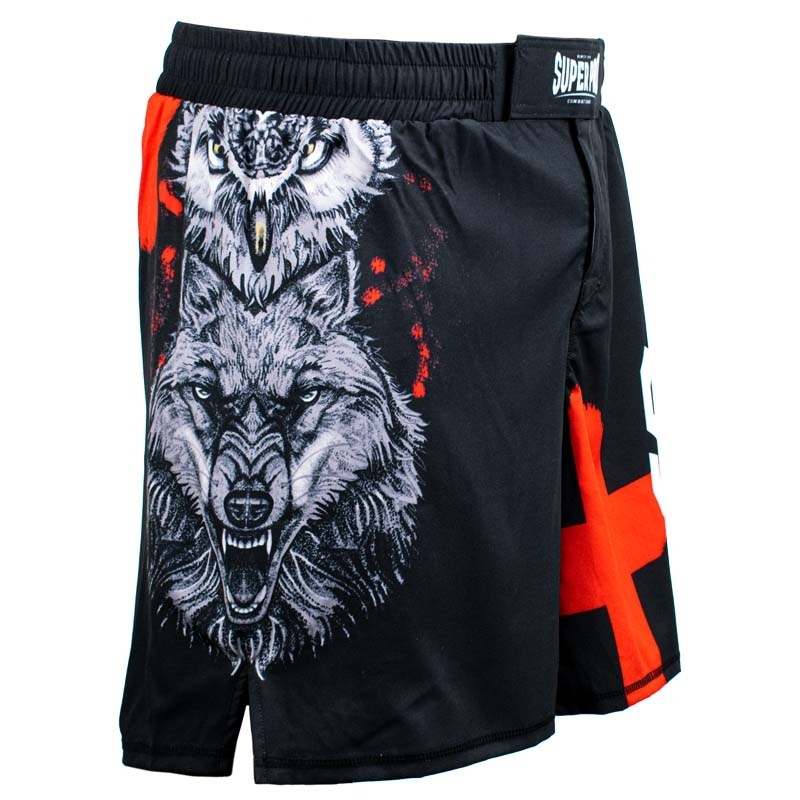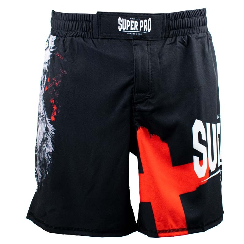 MMA broek van Super Pro, gemaakt van 180 grams, 97% polyester en 3% spandex. De broek is ontzettend licht en voorzien van een kleine split aan de zijkant. De tailleband is voorzien van een dubbele klittenbandsluiting, vetersluiting en is elastisch. De broek is volledig gesublimeerd zodat de opdruk niet vervaagd. Door de combinatie van materiaal, sluiting en pasvorm is dit de perfecte MMA-short.