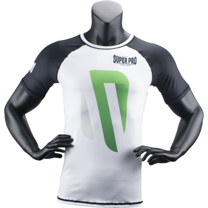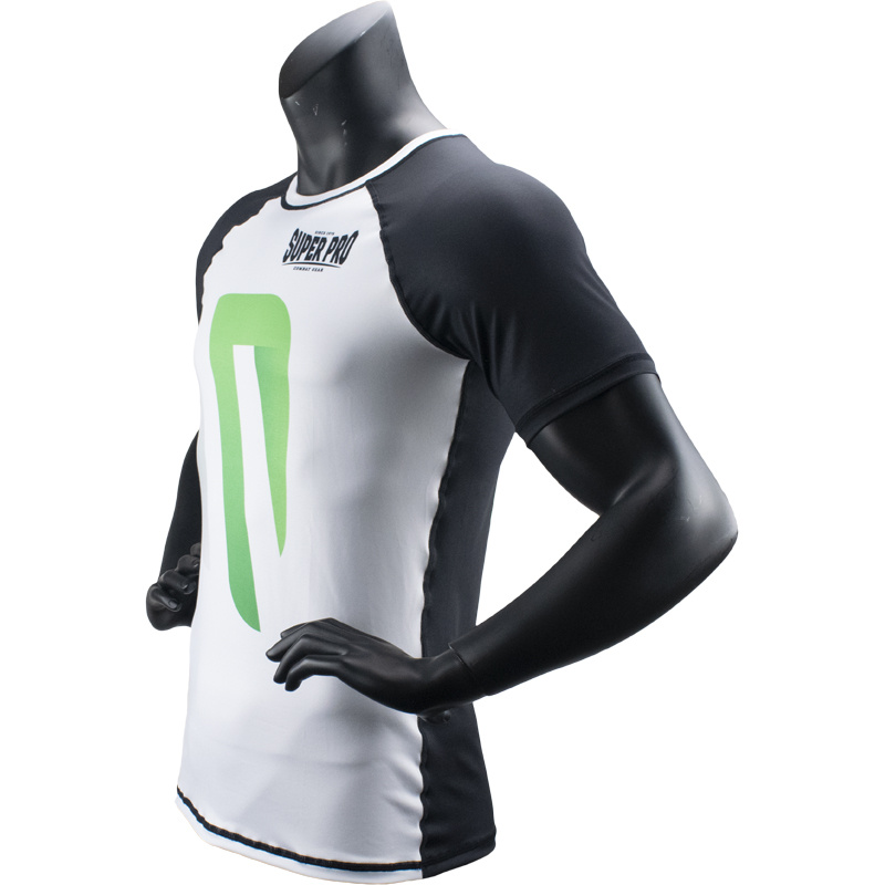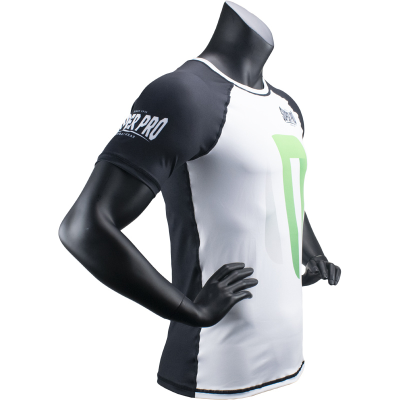 Rashguard van Super Pro, gemaakt van 250 grams, 85% polyester en 15% spandex. Door de combinatie van materiaal sluit deze netjes aan om je lichaam en droogt deze snel. Door de compressie-fit worden je spieren warm gehouden en de doorbloeding gestimuleerd. Het rashguard is volledig gesublimeerd zodat de opdruk niet vervaagd. Door de flat-lock naden schuurt het shirt nergens.