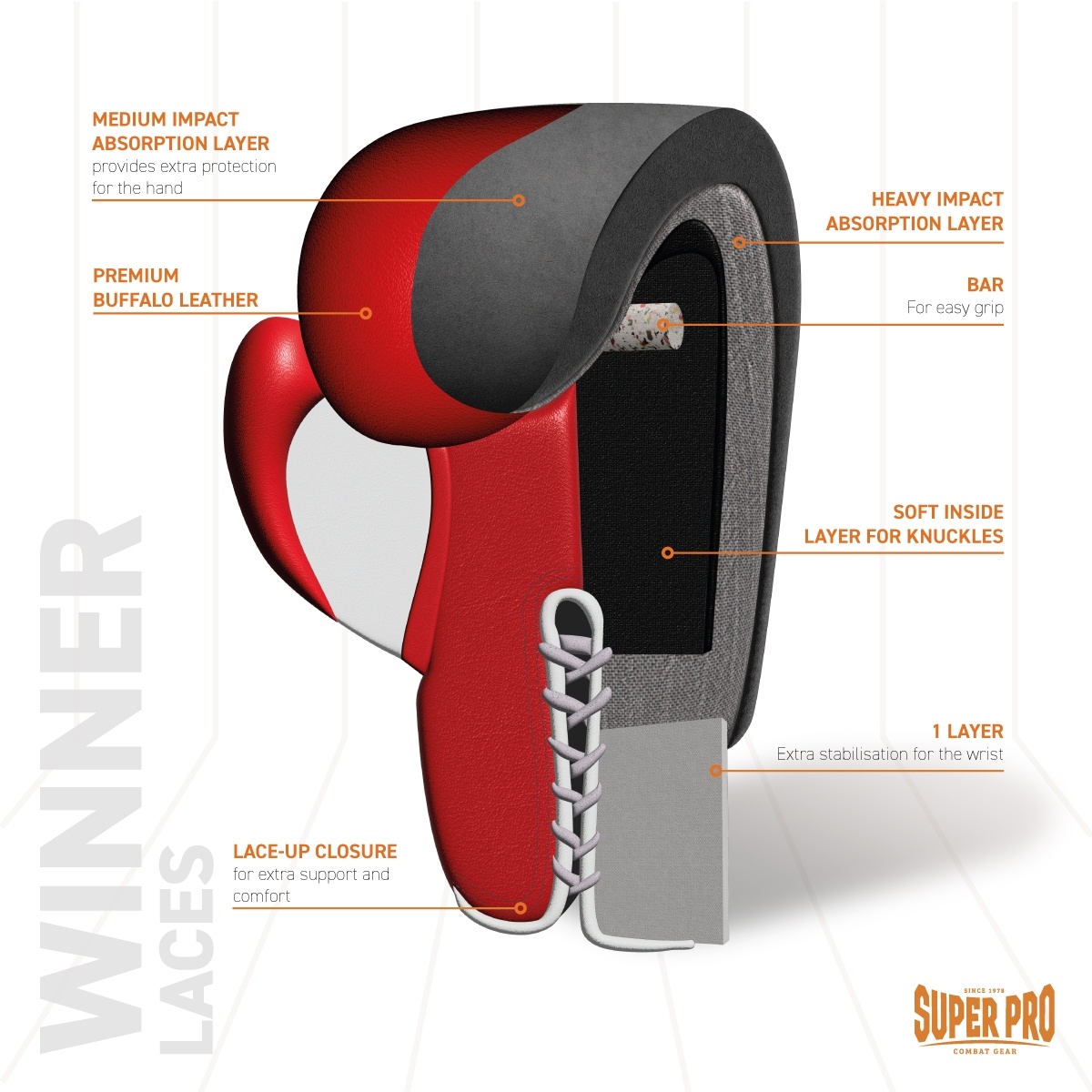 Super Pro Combat Gear Winner Wedstrijdhandschoenen Veter, rood - wit