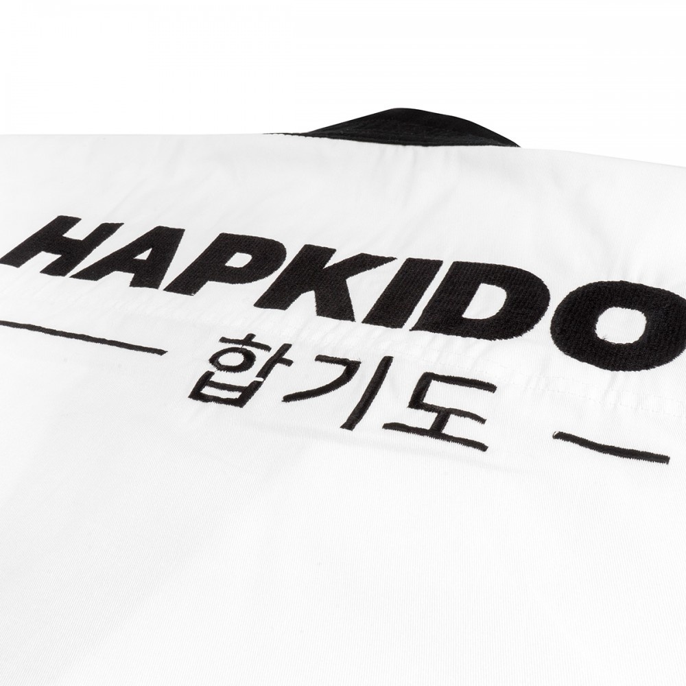 - Hapkido-identificatie: Geborduurd op de achterkant en op het geweven label dat zowel op de jas als op de broek is geplaatst.