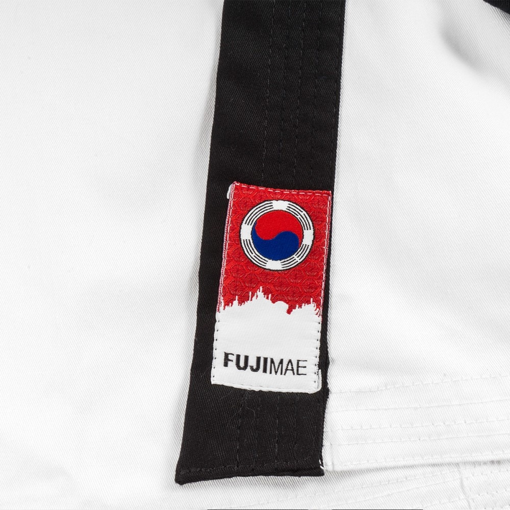 - Hapkido-identificatie: Geborduurd op de achterkant en op het geweven label dat zowel op de jas als op de broek is geplaatst.