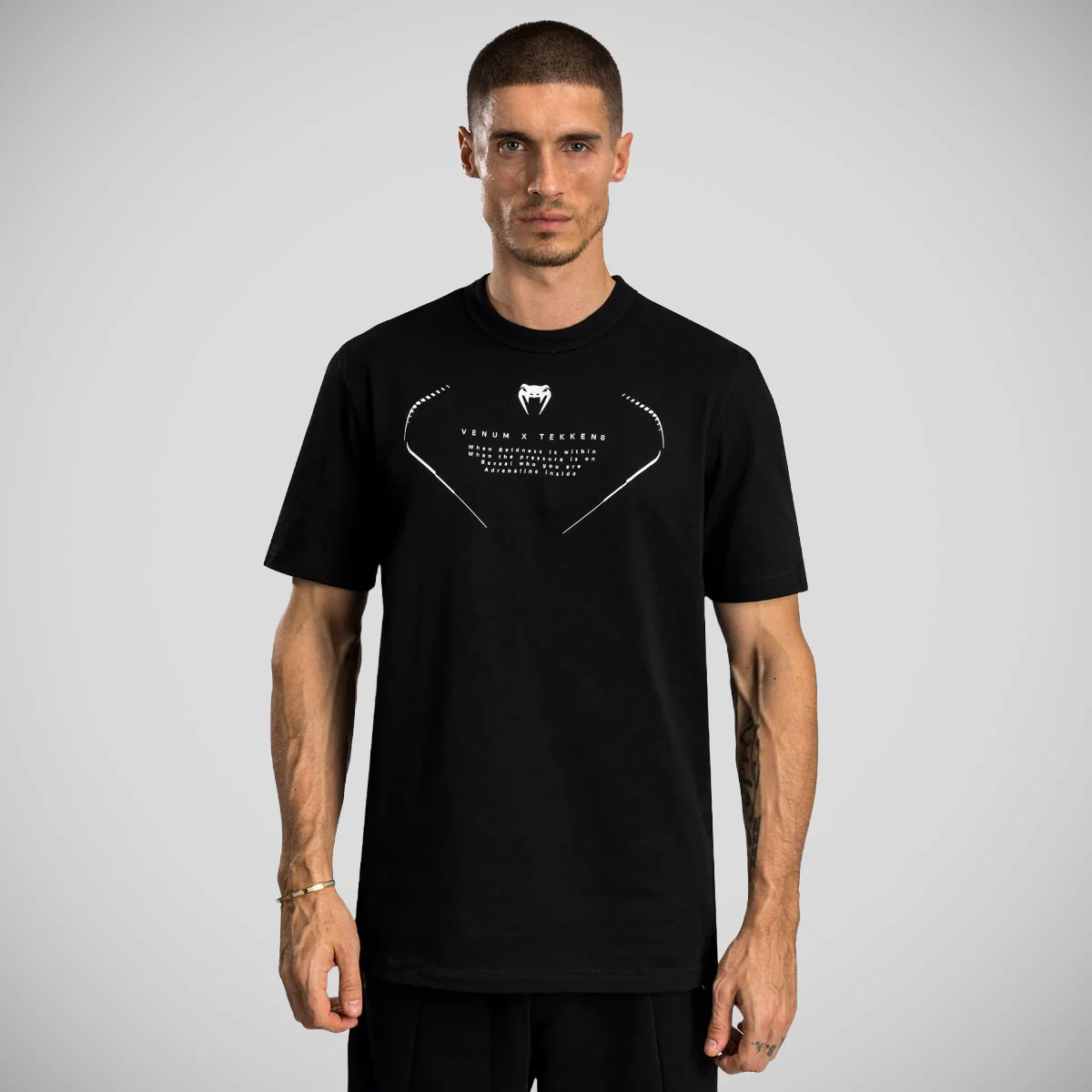 Het Venum x Tekken 8 Jin Kazama T-shirt is een eerbetoon aan de eervolle karatestrijder Jin Kazama. Dit klassieke zwarte T-shirt is aan de achterkant voorzien van zijn kenmerkende engelenvleugels, met het Venum-logo in het midden bij de hals. Op de voorkant staat de motiverende tekst: "When boldness is within / When the pressure is on / Reveal who you are / Adrenaline Inside." Regular fit Korte mouwen Ronde hals 100% katoen Zeefdruklogo en afbeeldingen Wassen op 30 °C Wassen met soortgelijke kleuren Niet in de droger Niet bleken