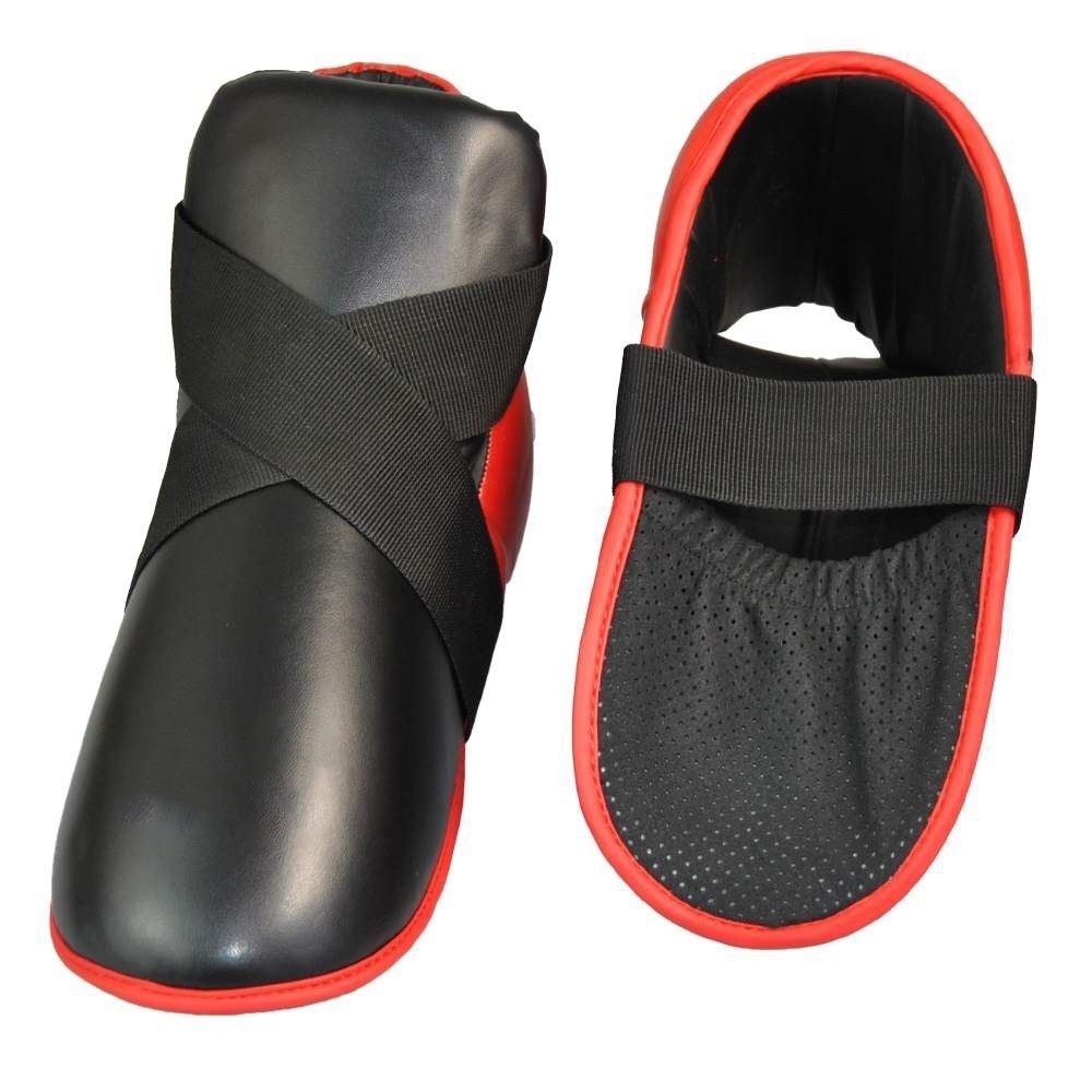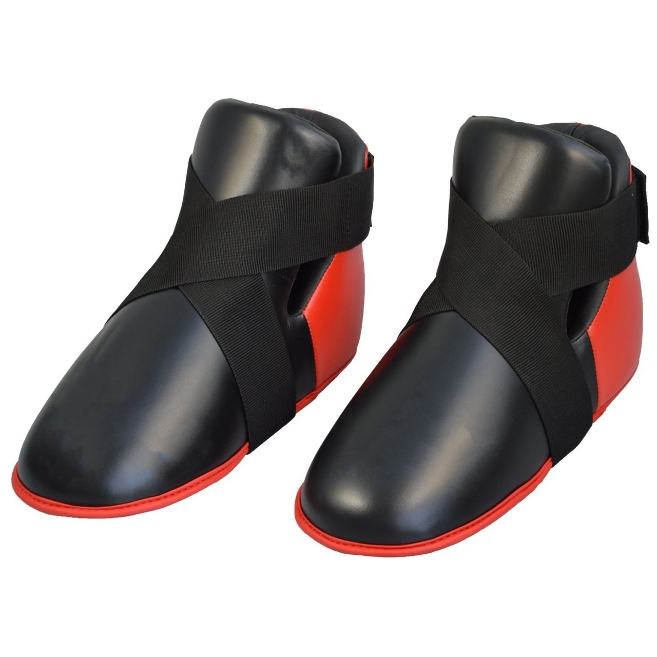Voetbeschermer in fijne rood-zwart 2-kleurige optiek van robuust kunstleer materiaal met klittenbandsluiting
