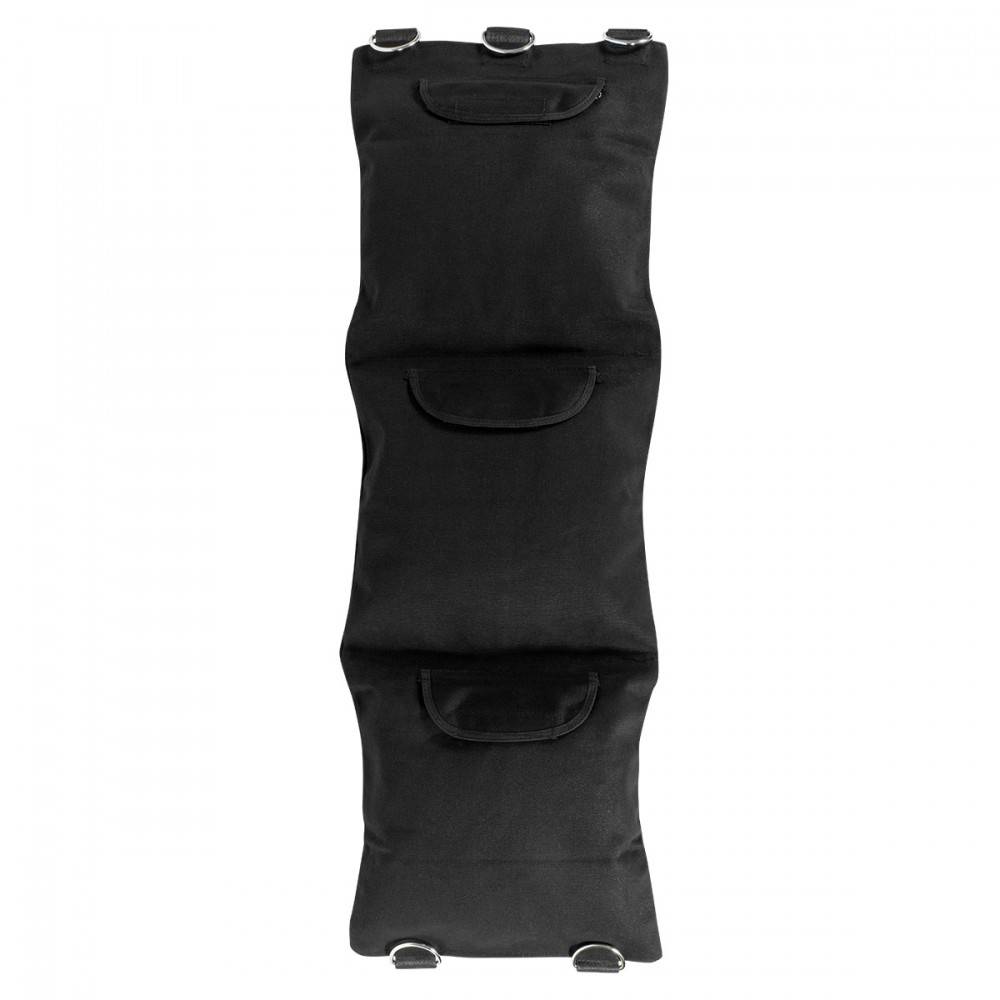 De Wandmakiwara heeft drie opvallende oppervlakken, waardoor het mogelijk is om op verschillende niveaus te slaan. Het totale formaat is 86 x 27 cm, wat ideaal is voor scholen met studenten van verschillende hoogten en leeftijden. Het is gemaakt van een resistente katoenen canvas constructie, met de belangrijkste opvallende oppervlakken bekleed met synthetisch leer voor een aangenamer en opvallender uiterlijk. De naden zijn versterkt en er is een beschermde ritssluiting om krassen te voorkomen. Het wordt leeg geleverd en kan worden gevuld met zand, bonen, rijst of equivalenten tot 80% van de capaciteit om overbelasting van de naden te voorkomen. Het heeft ook D-metalen ringen voor sterke ondersteuning en eenvoudige installatie.