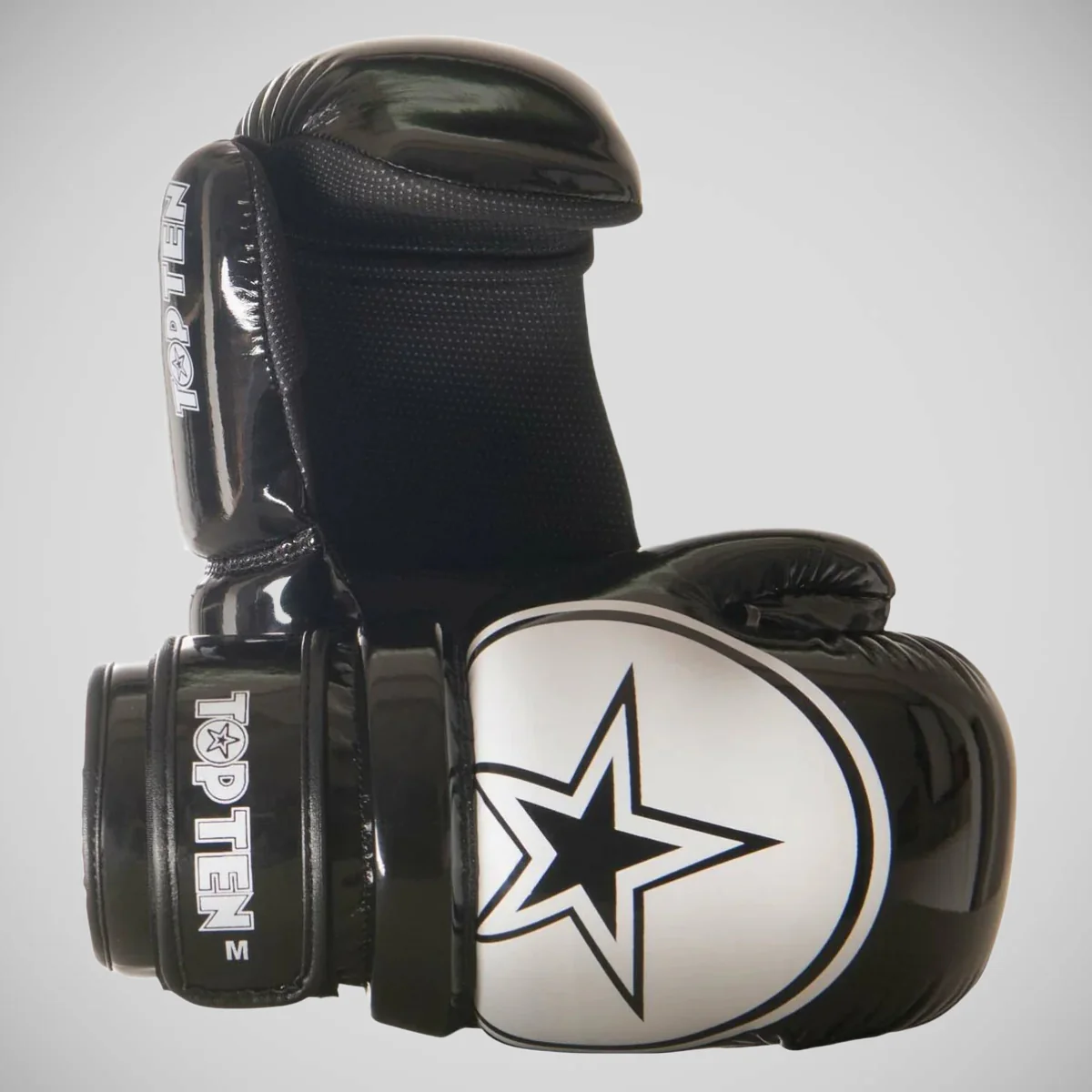 Met de lichtgewicht zwart-witte Top Ten Glossy Block Star Pointfighter-handschoenen kun je vol zelfvertrouwen en stijl de ring betreden. Bereid je voor om je tegenstanders te verslaan, terwijl je je polsen beschermt en ondersteunt op cruciale momenten tijdens het blokkeren.